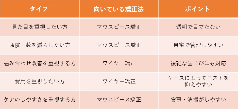 矯正治療は、歯並びの状態だけでなく、ライフスタイルや優先したいポイントによって最適な方法が変わります。